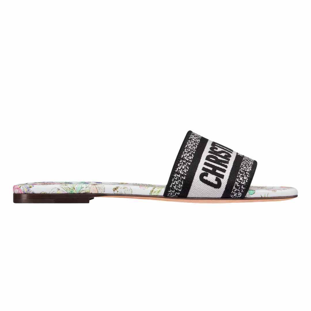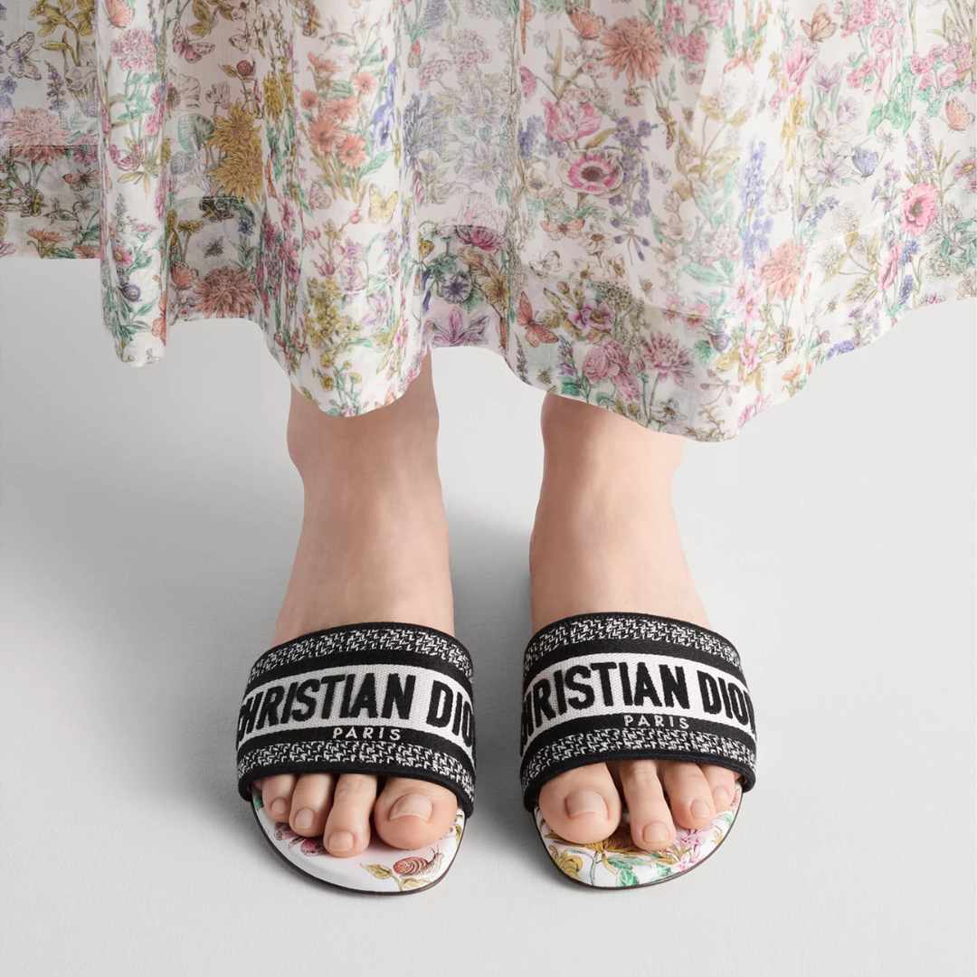 Part of the Dior Lucky capsule, the Dway slide is a hallmark and timeless style showcasing a white multicolor Flowers Calendar Allover motif, paying homage to Mr. Dior's passion for flora and fauna through a bucolic floral design. The upper is embroidered with the Christian Dior Paris signature for an instantly recognizable touch. The shoe's minimalist silhouette will slip on easily to complete a laid-back outfit, and will pair well with other creations from the Dior Lucky capsule.