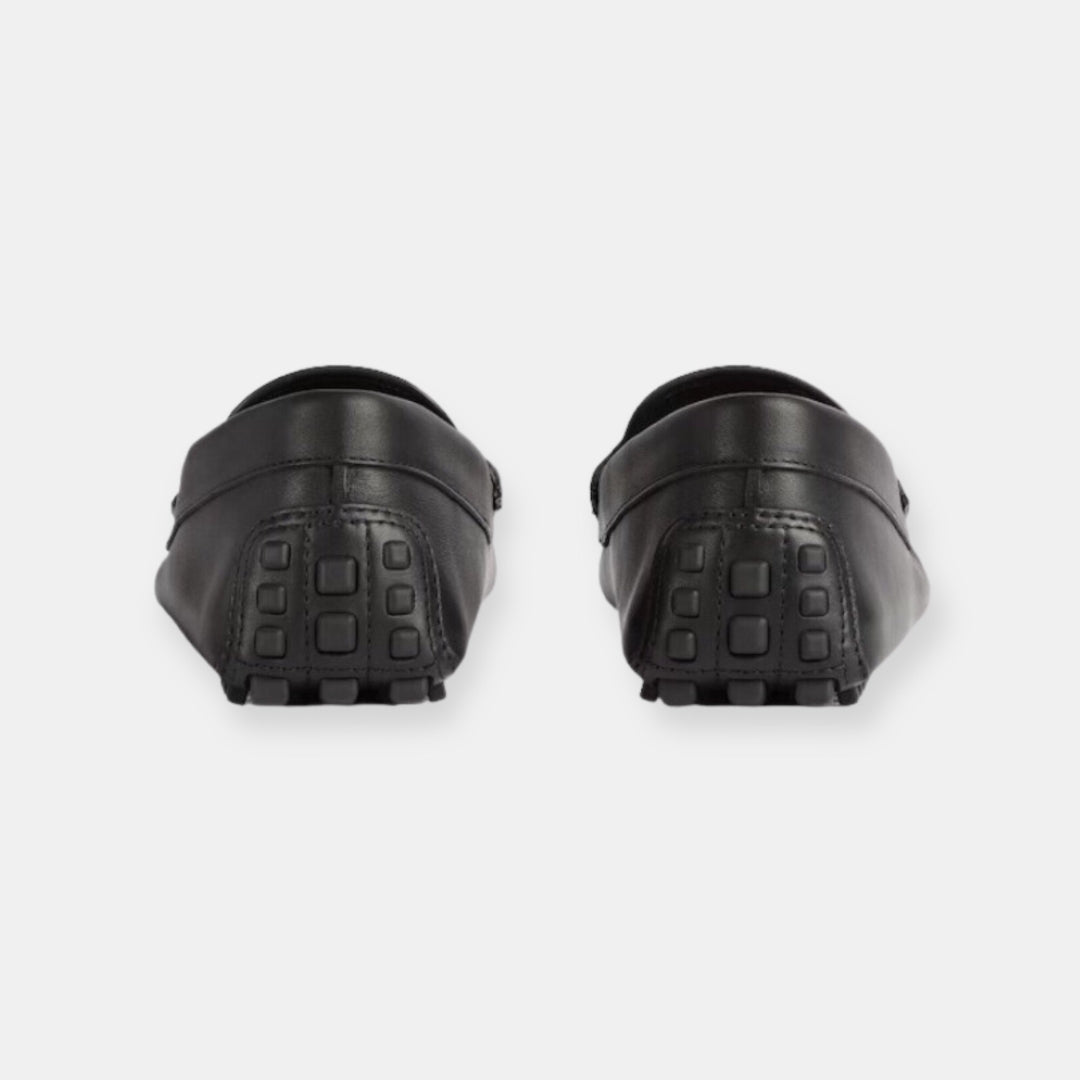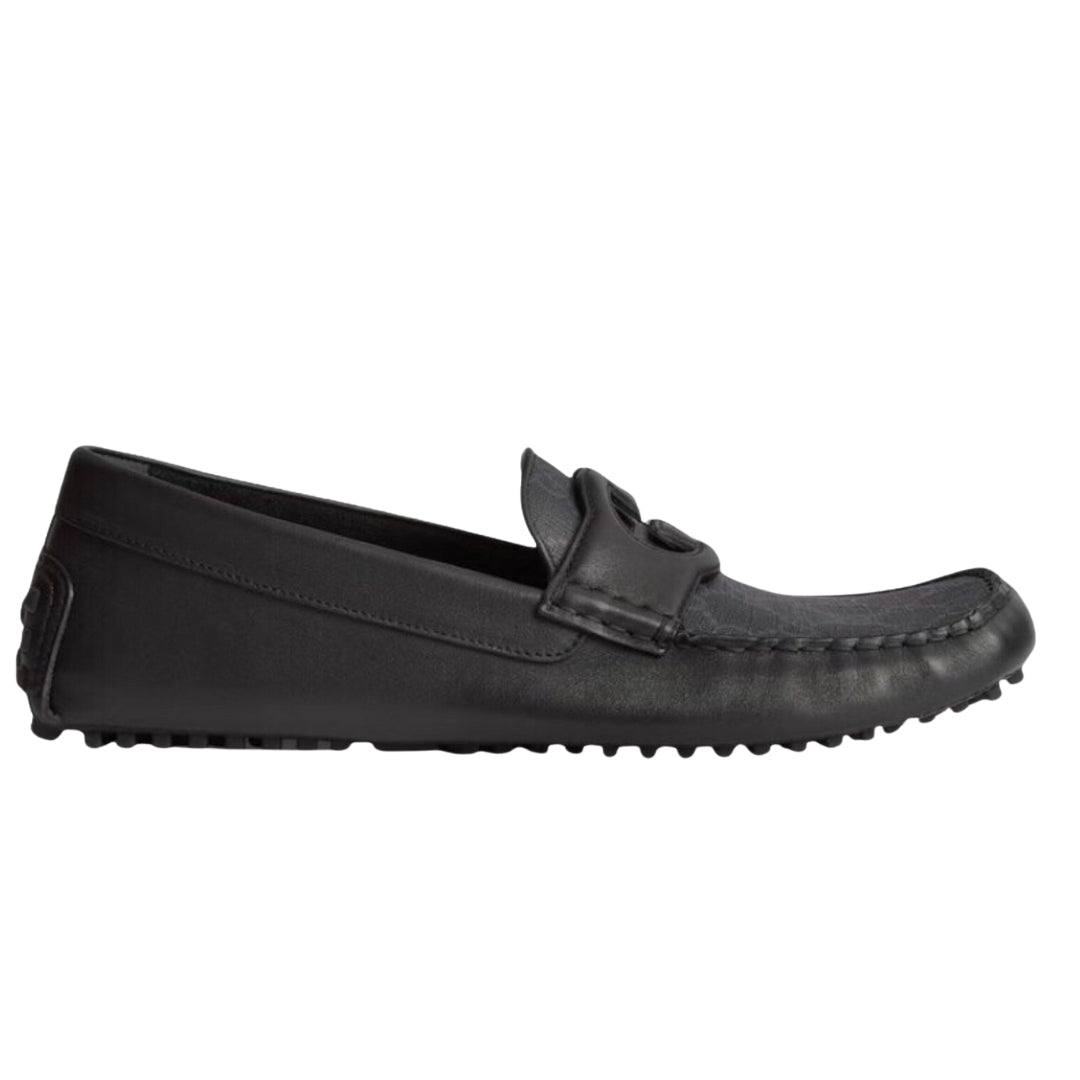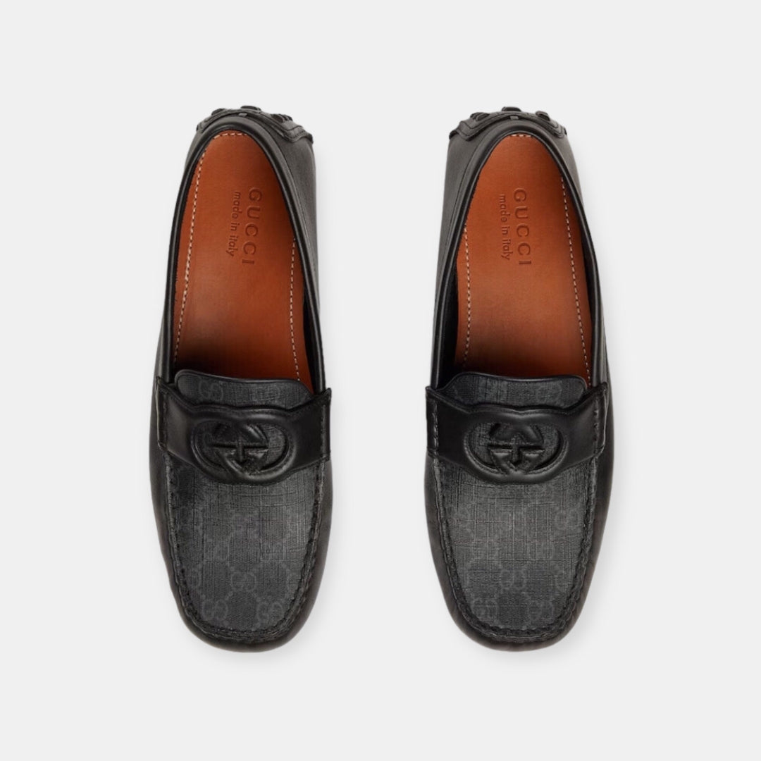 GG-canvas buckle loafers from Gucci featuring black, leather, classic GG canvas, logo-engraved buckle, silver-tone hardware, round toe, branded insole, leather outsole, stacked sole and slip-on style.