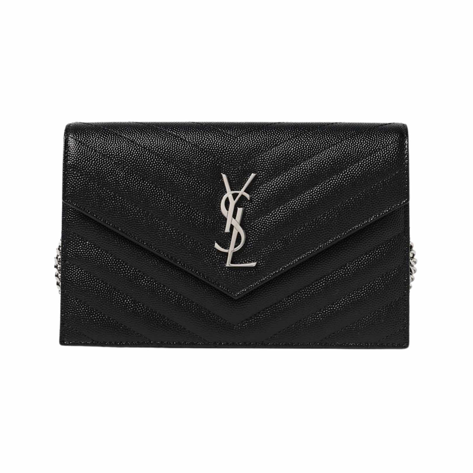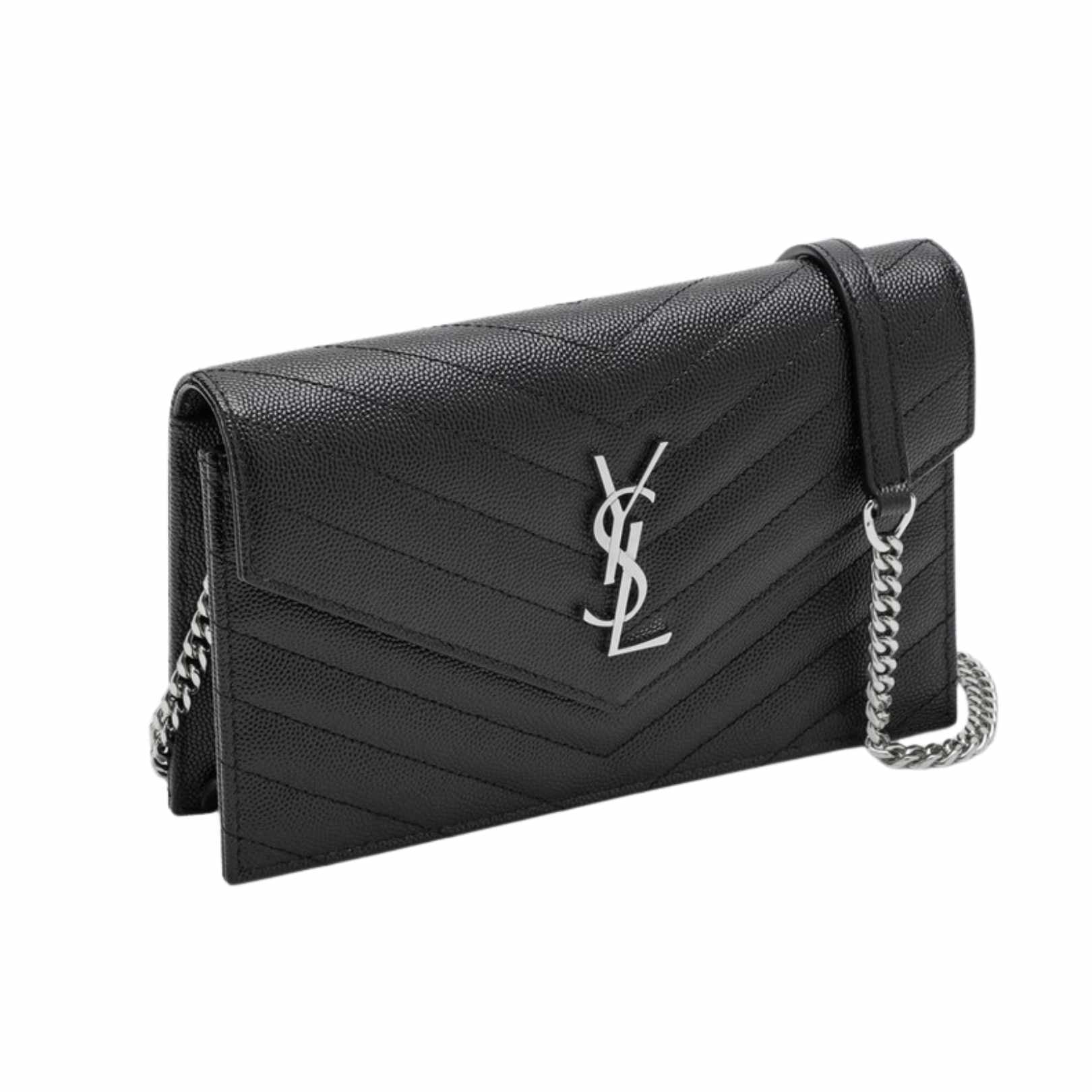 Black grain de Poudre leather chain clutch from Saint Laurent featuring quilted Y-stitching, a flap and button fastening, a front YSL woven logo, a detachable leather and chain shoulder strap, an internal zipped pocket, six card slots, a banknote compartment and silver-tone metal hardware.