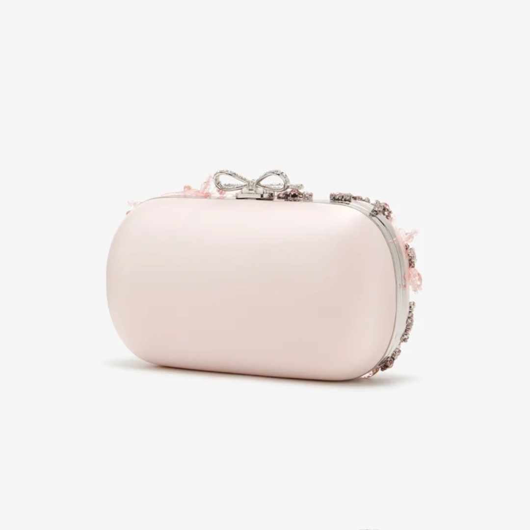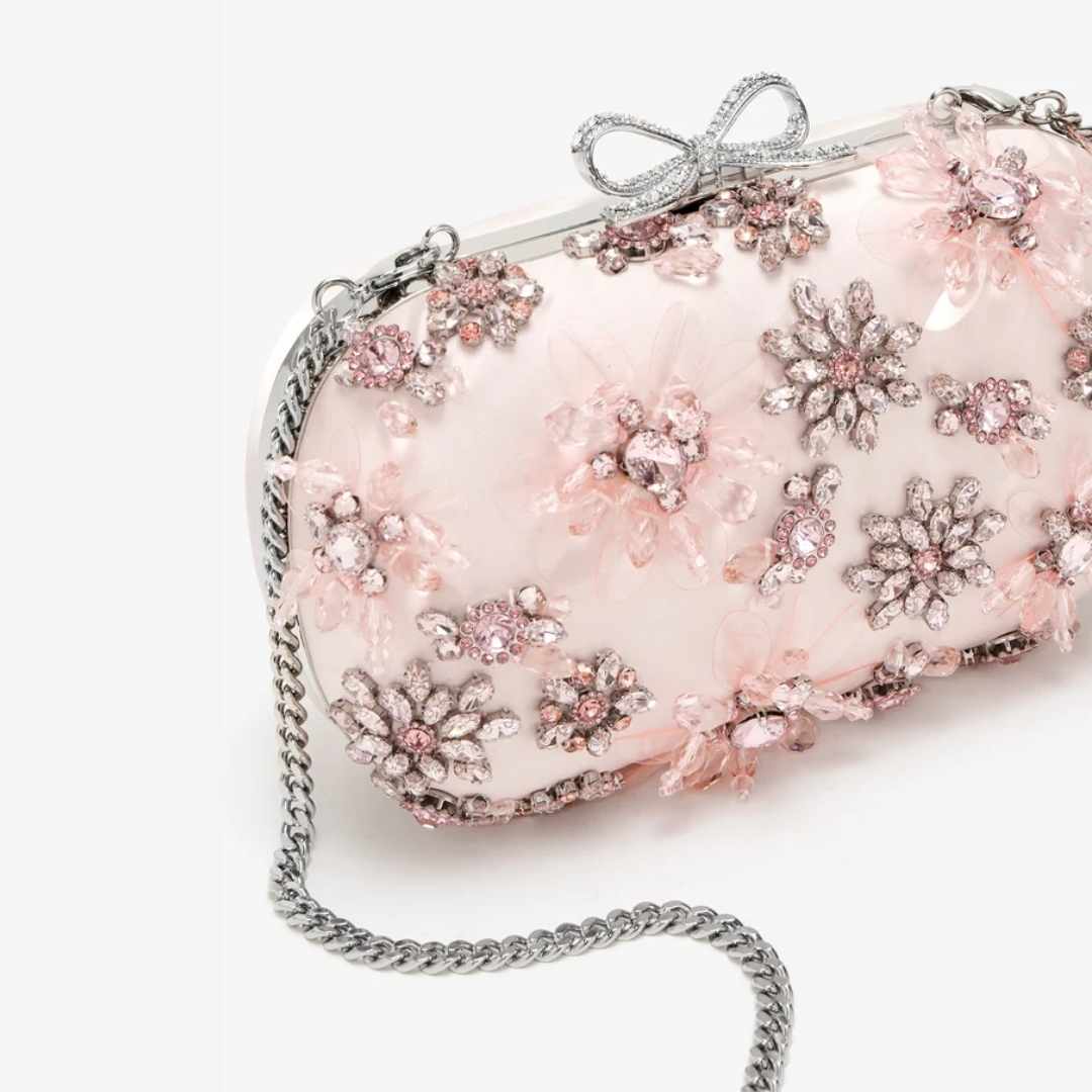 Delicate yet dazzling, this clutch sparkles with floral crystal embellishments for a touch of romantic glamour. Its petite satin silhouette, elegant bow clasp, and detachable chain strap make it a perfect accessory for evening elegance.
