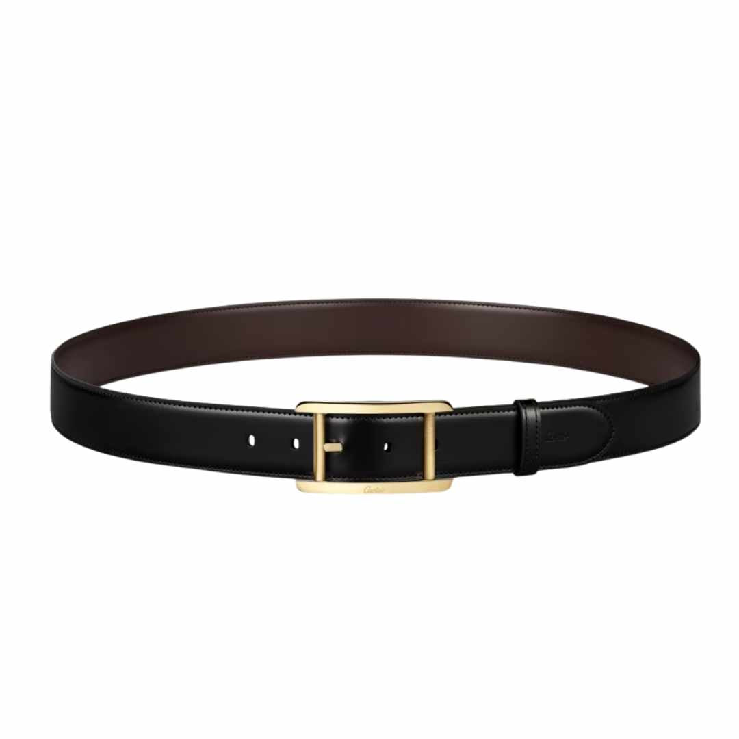 Belt with smooth gold-finish ardillon buckle, Cartier signature. Strap in black and brown cowhide, embossed "Cartier" marking. Dimensions: 35 mm wide x 1,230 mm long. Adjustable.