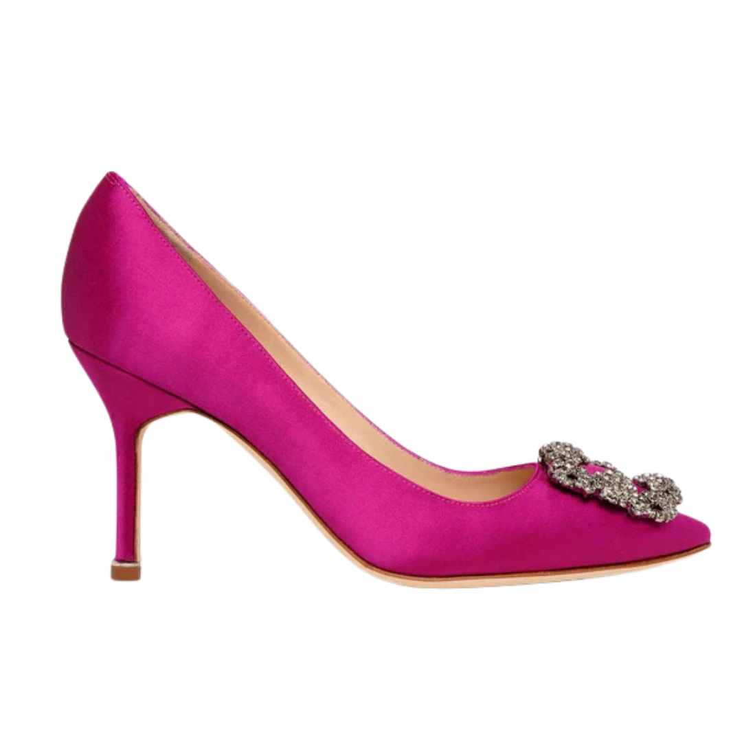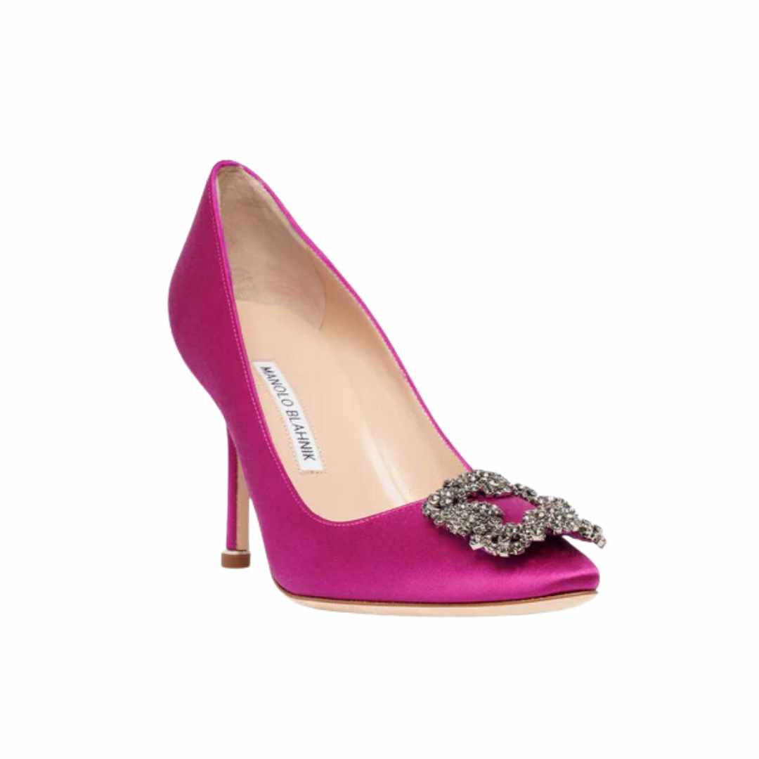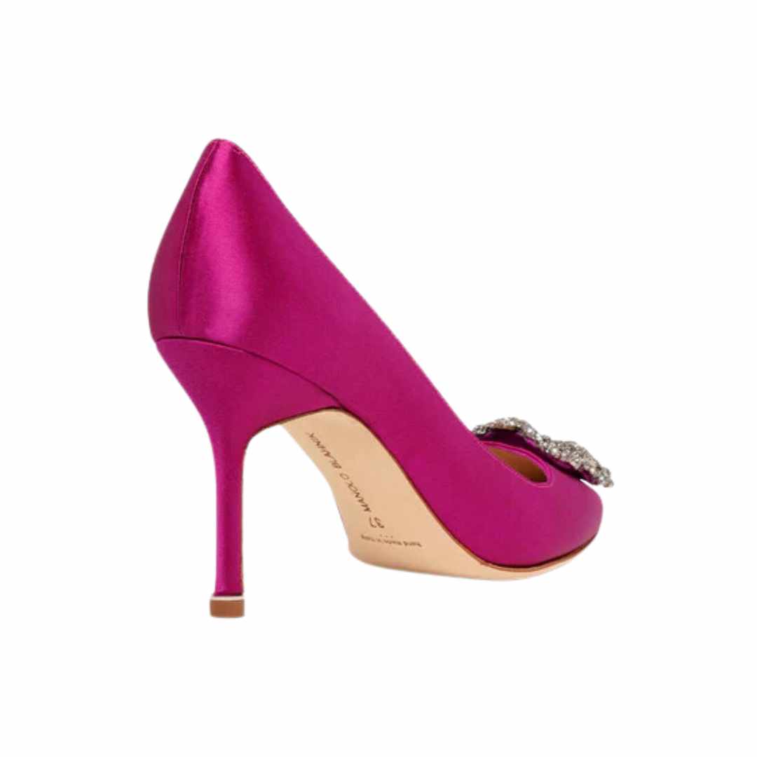 Manolo Blahnik 'Hangisi' Décolleté, satin finish, pink colour, fuchsia shade, pointed, crystal jewel detail applied on front, stiletto heel, leather sole