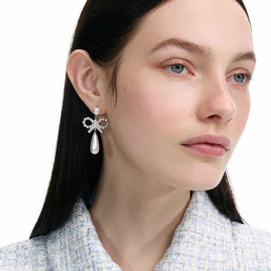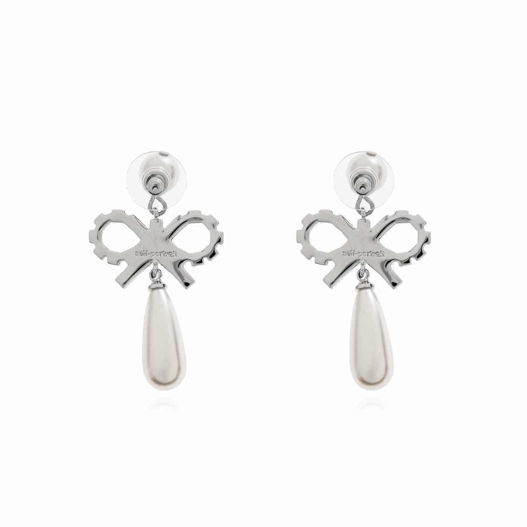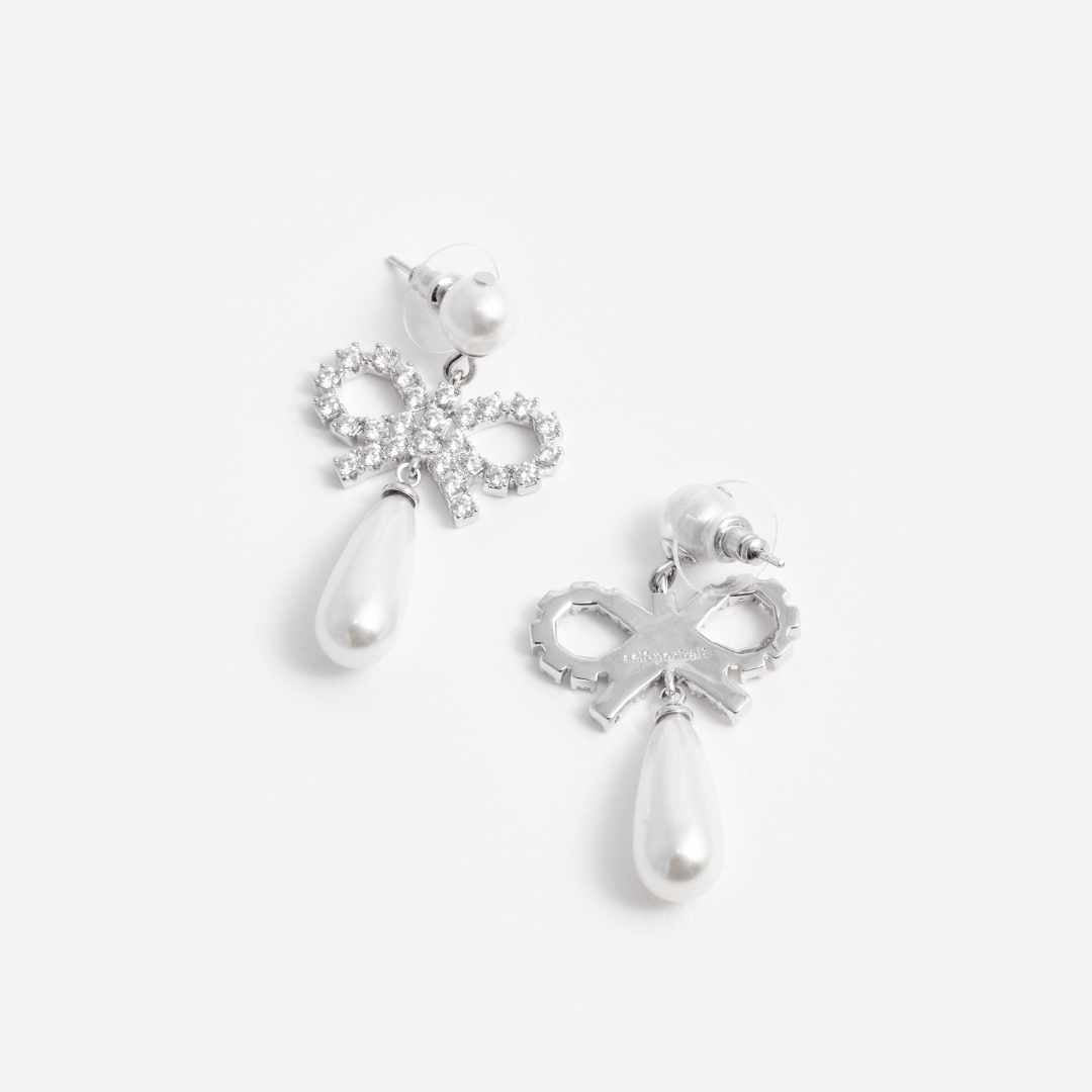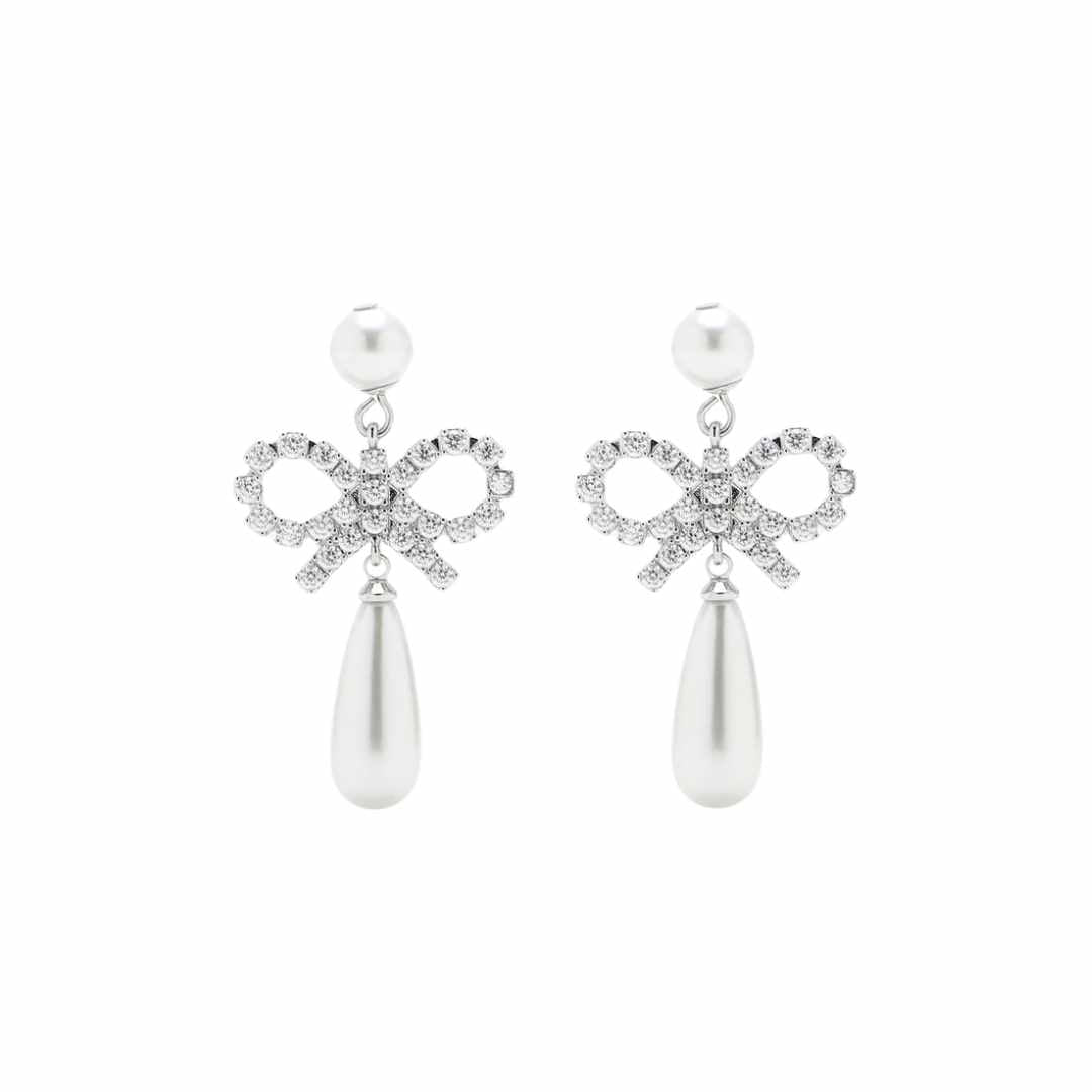 Understated elegance comes with these crystal bow earrings, adorned with a sleek pearl droplet. Wear them with every day ensembles or pair with our sparkling bags for a fully accessorised look.