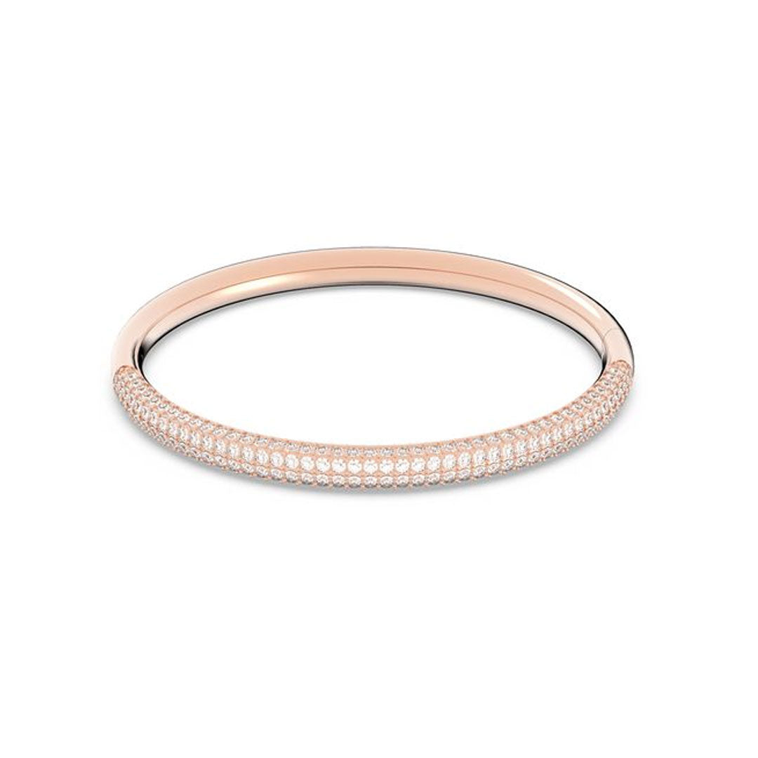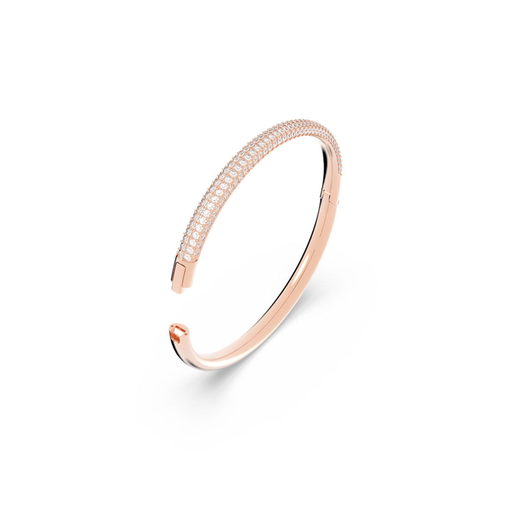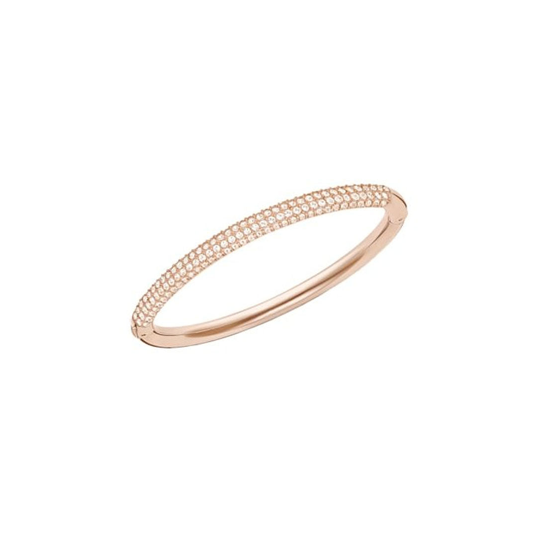 In line with the rose gold trend, this stainless steel bangle impresses with four rows of sparkling Silk crystal pavé on the front side. Wear it alone or stack it together with other bangles for a glamorous look. The fully integrated closure ensures a smooth finish.