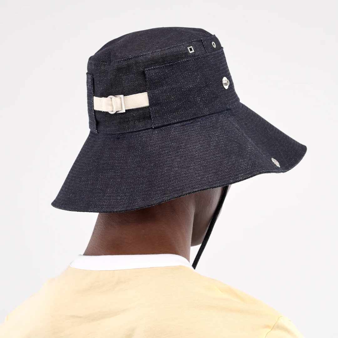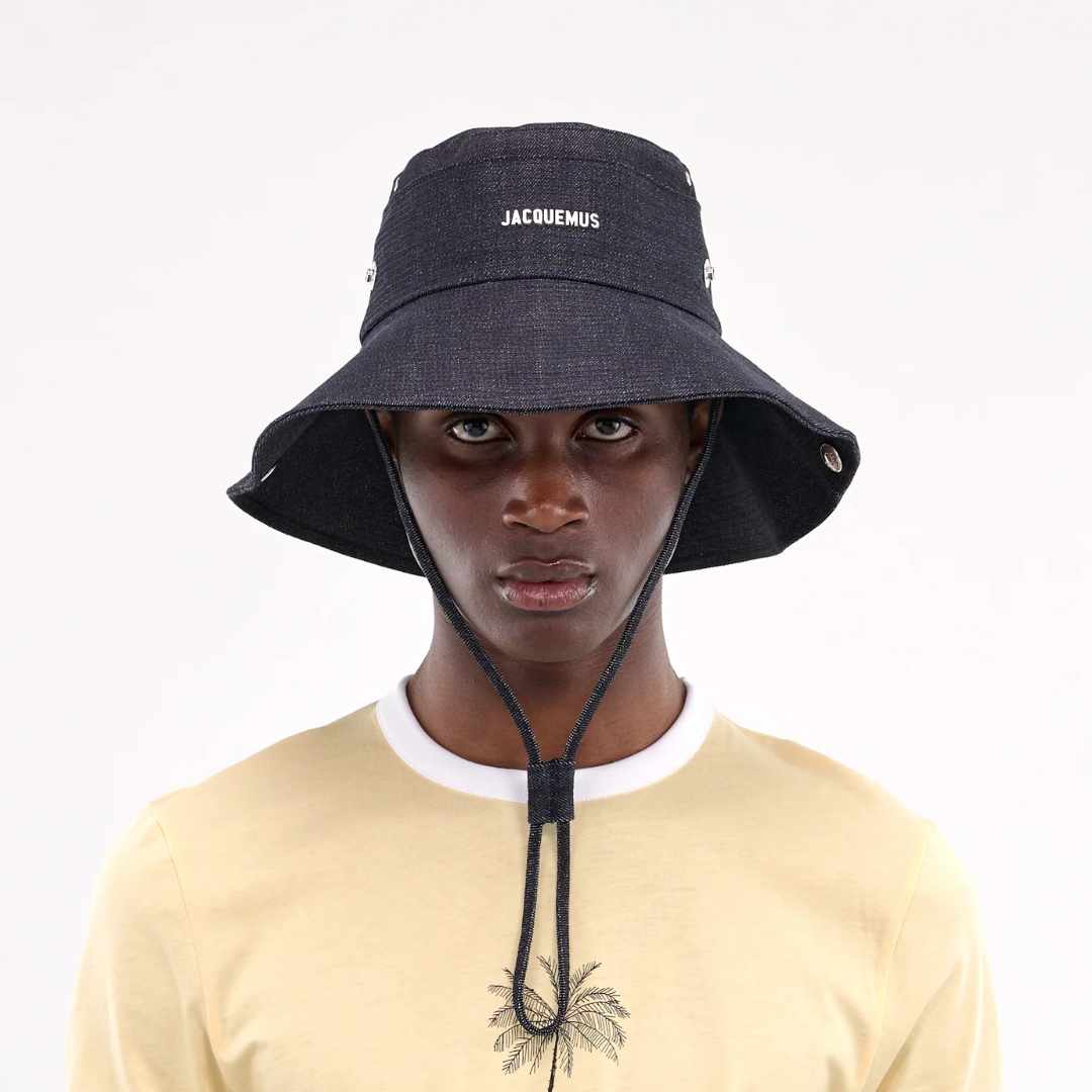 JACQUEMUS hat in navy, bucket hat design, paneled denim construction, tonal topstitching, front metal logo plaque, signature square & circle metal eyelets, press-stud buttons & logo engraving, back cinch strap, floppy brim, adjustable chin strap fastening, fitted.