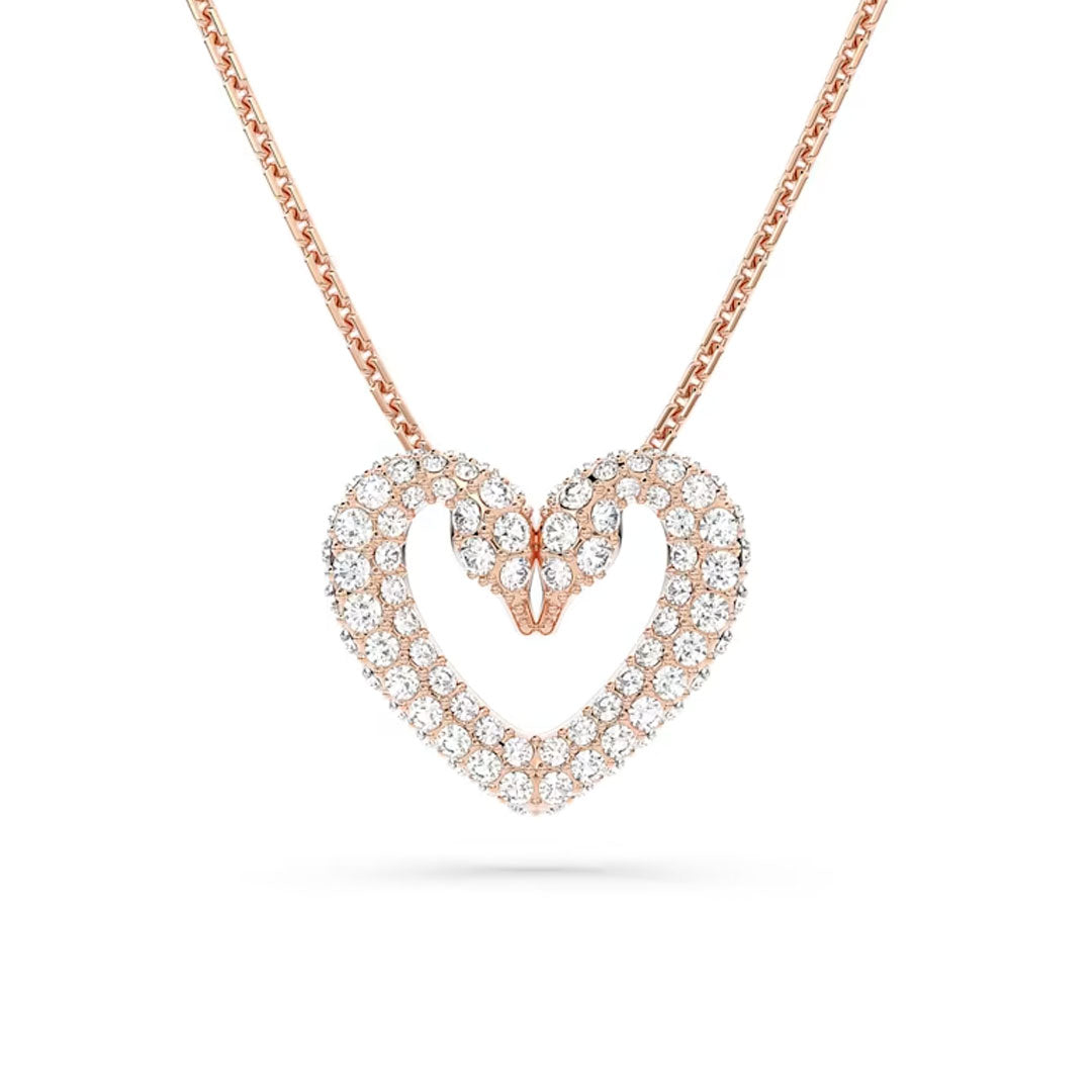Embodying the beauty of nature with its double swan design, this delicate, heart-shaped pendant symbolizes the power of eternal love – and a new beginning for the Swarovski swan emblem. It features refined pavé crystals set against a rose gold-tone plated chain. A timeless and radiant choice for your everyday wardrobe. This pendant is part of the Una Family, designed for Collection III.