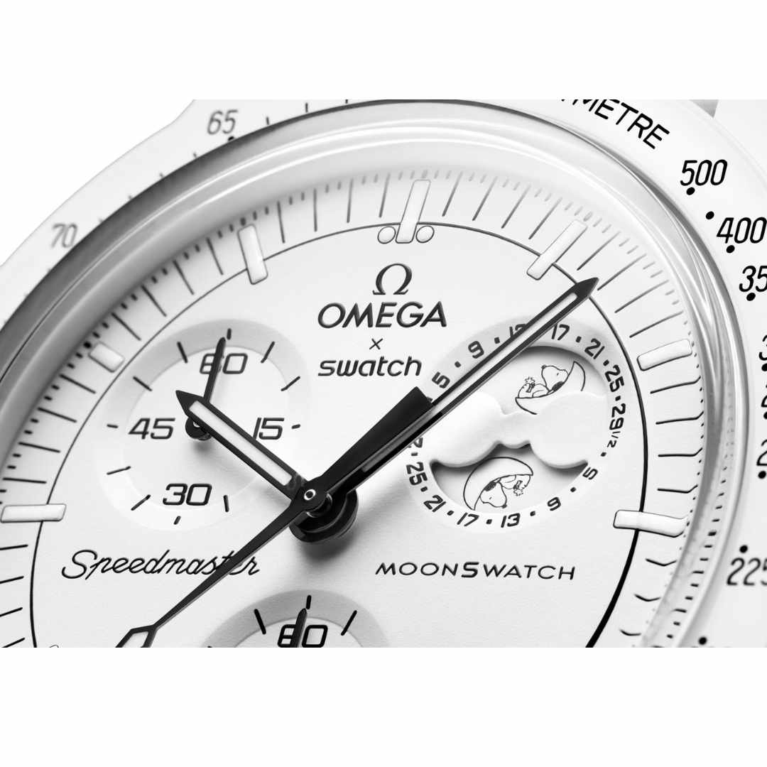 Referencing the full moon, this non-limited model boasts an all-white color scheme. It features a Bioceramic case, crown and pushers as well as a VELCRO® strap. The chronograph seconds hand, subdial hands, and tachymeter scale are in black. The subdials and bezel are in white. This model stands out with its moon phase function, arguably the most poetic of all watch complications. Snoopy who has been associated with human space missions since the 1960s, is featured lying on the moon on the moon phase disc, which rotates in the subdial set at 2 o’clock. Under UV light, a hidden quote from a Snoopy comic strip nestled amidst crescent moons and stars, is revealed on the unique subdial. All dials in the collection carry the OMEGA X Swatch branding, the iconic Speedmaster logo and the MoonSwatch logo. The box-shaped biosourced glass construction, the etched "S" in the center of the glass referencing the Swatch logo, the fine and sophisticated circular pattern on the dial outer ring and the recessed subdials, the sharp and smooth lugs construction, the iconic “dot over 90” detail on the tachymeter scale and of course the unique Bioceramic feel are common to all models. The indexes, hour and minute hands and chronograph seconds hand sport Grade A Super-LumiNova® for a perfect glow in the dark.